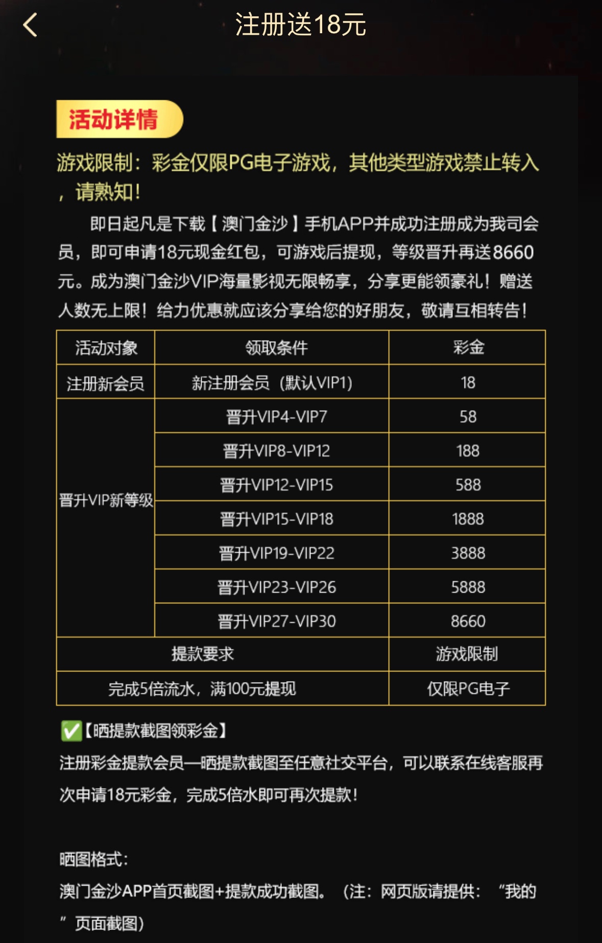 注册绑卡,不绑卡申请会封号,5倍流水,限PG电子,只能提100,签到还送6彩金