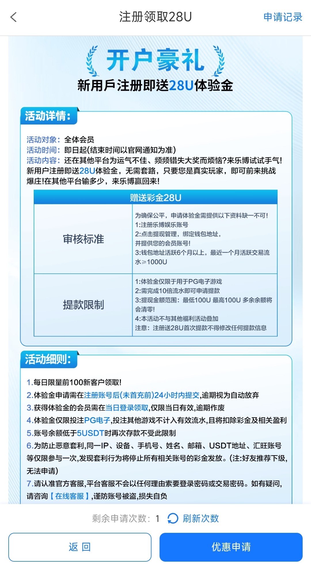 每天仅限前100注册的用户怕名额满可以等过了12点,注册绑定钱包地址,提供账号给客服,需要提供:钱包需要活跃6个月以上,近一个月交易流水不能少于1000U,交易笔数30以上,仅限:PG电子,10倍流水,最高低100U提款,多余清零,查设备IP多账号